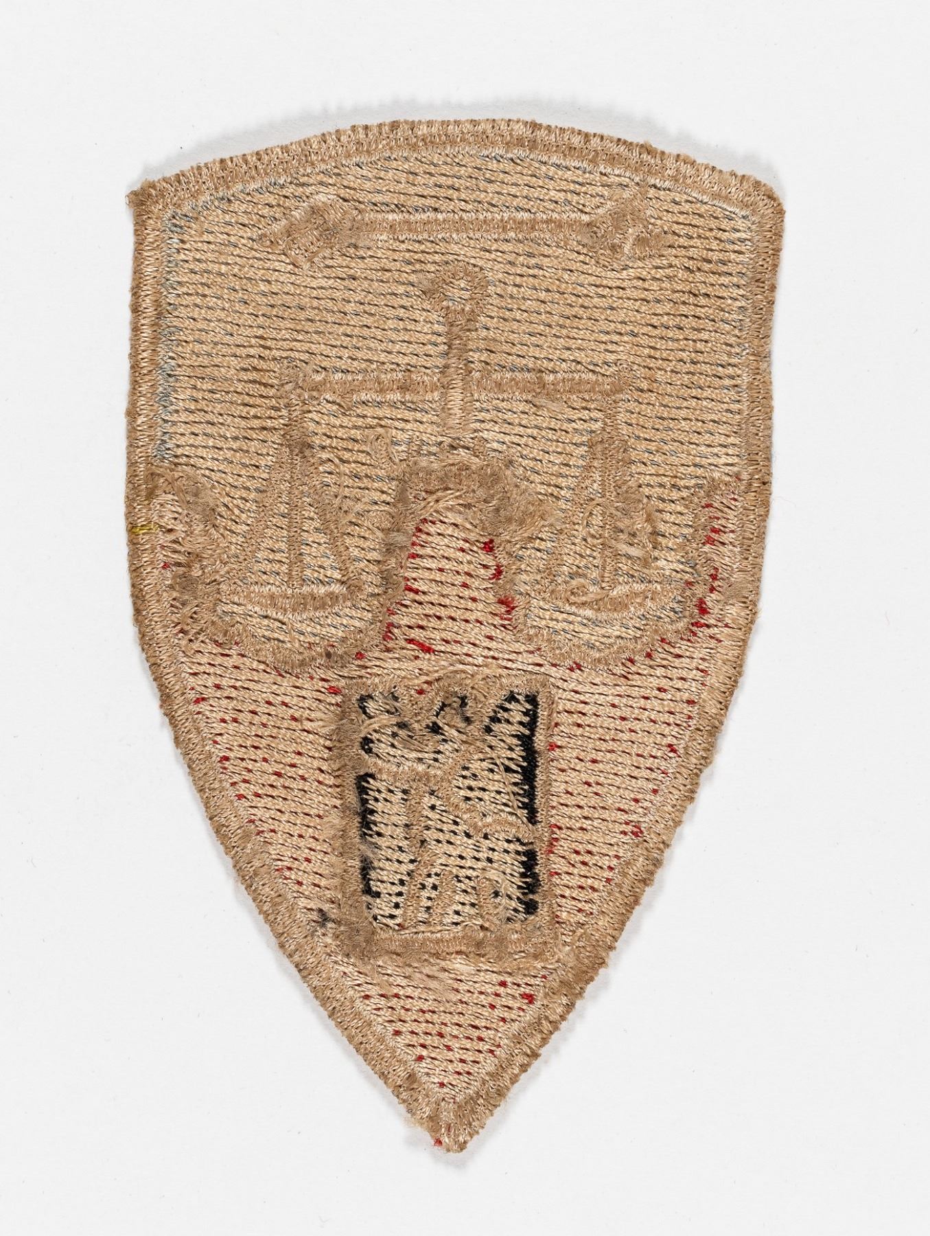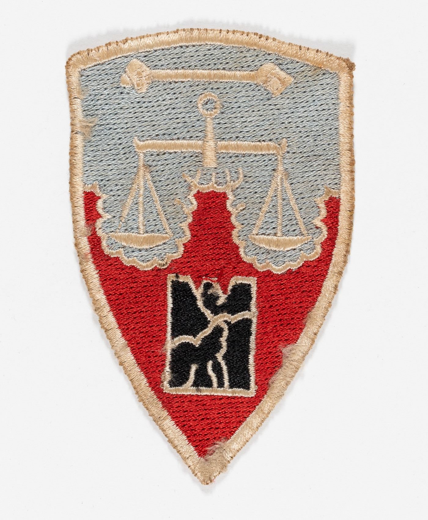 WWII U.S. Army embroidered Nuremberg Trials DUI patch. A Distinctive Unit Insignia for the 6850 Internal Security Detachment at the International Military Tribunal, Nuremberg. Patches and badges were produced in Germany for the occupation forces by different makers without regulations, resulting in different examples. 2.25 x 3.75 inches.