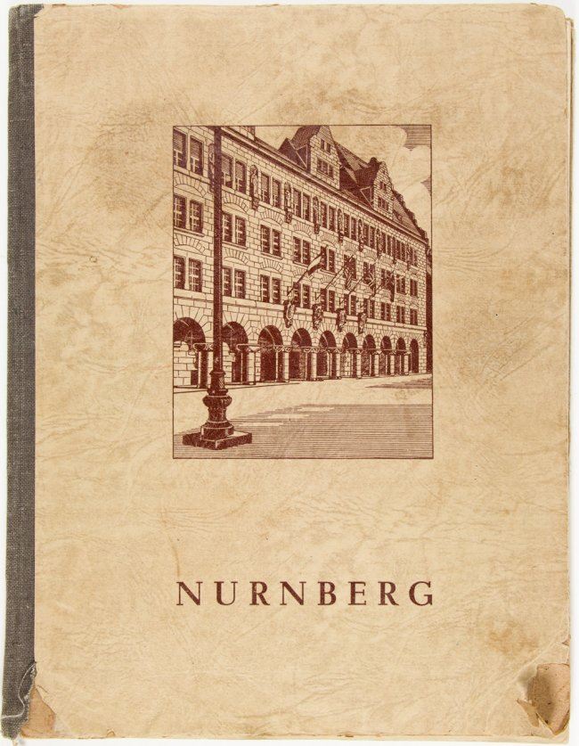 Book Nurnberg, by Charles W. Alexander (Nurnberg: Karl Rulrich & Co.), 1946. First edition. The well known compilation of photographs depicting the shattered city, the proceedings at the trial of the major war criminals, defendants, Spandau Prison, and scenes of the slow recovery being made by the population. Covers coming loose from contents with corners chips and tears to covers, contents are bright and clean.