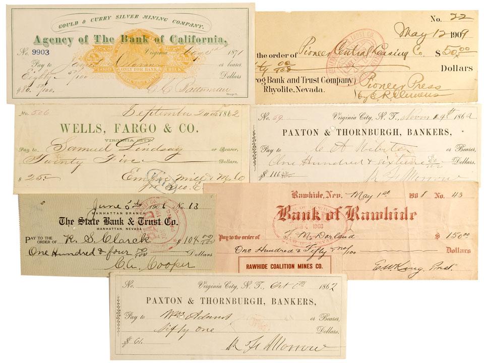 Rare group of 7. 1: Bullfrog Bank and Trust Company, Rhyolite; check #22 issued May 12, 1909 payable to Pioneer Central Leasing Co. for $50. Front is stamped “paid” with red ink; reverse contain endorsement and purple stamp. 2: Group of two Paxton & Thornburgh Bankers checks, Virginia City, N. T.; Check no. 59 dated November 14, 1862 to CA Webster for $116.50; second check is not numbered but was dates October 6, 1862, payable to “Mrs. Adams” for $61. Stamped “paid” but not endorsed. 3: The State Bank & Trust Co., Manhattan; check no. 63 issued on June 5, 1906 payable to RS Clarck for $104. Green paper with black ink, stamped on front with “paid.” Endorsed on reverse. 4: Bank of Rawhide; check no. 43 issued on May 1, 1908 to FM Darland for $150. Peach-colored paper with rust ink; Agency for the Rawhide Coalition Mines Co.; stamped on front with “paid,” Endorsed on reverse. 5: Wells Fargo & Co., Virginia City; check no. 506 issued September 2, 1862 to Samuel Lindsay for $25. Signed by Geo. E. Childs for the Empire Mill &M. Co. Not endorsed. 6: Gould and Curry Silver Mining Company: Agency of the Bank of California, Virginia City; check no. 9903 issued on May 3, 1871 to James Delavan for $80.50. Has orange revenue stamp (RN-C21).