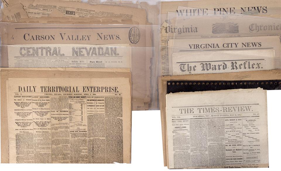 Nevada Newspapers Collection. Lot of 30. 1. Carson Valley News: fragile condition, some partial editions (2)Friday edition, May 26, 1876, Vol. 2, No. 15(3) Friday edition, June 2, 1876, Vol. 2, No. 16(4) Friday edition, April 14, 1876, Vol. 2, No. 9 (5)Friday edition, April 21, 1876, Vol. 2, No. 10(6) Friday edition, April 28, 1876, Vol. 2, No. 11(7) Friday edition, May 12, 1876, Vol. 2, No. 13(8) Friday edition, June 9, 1876, Vol. 2, No. 17(9) Friday edition, June 16, 1876, Vol. 2, No. 18(10) Friday edition, June 30, 1876, Vol. 2, No. 20(11) Friday edition, July 7, 1876, Vol. 2, No. 21(12) Friday edition, July 14, 1876, Vol. 2, No. 22(13)Friday edition, July 28, 1876, Vol. 2, No. 24(14) Friday edition, January 14, 1876, Vol. 1, No. 48(16) April 4, 1915, Vol. 95, No. 51(17)The Independent, Sutro, Monday edition, December 15, 1879, Vol. V, No. 46 Lyon County Times, Dayton. (18) Saturday edition, October 13, 1883, Vol. XIX, No. 15 (19)Saturday edition,(20) March 15, 1884, Vol. XX, No. 11. (21) River Reveille, Austin. Friday edition, April 18, 1890, Vol. 54, No. 127 (22) Nevada State Journal, Reno (23) Wednesday edition, November 23, 1870, Vol. 1. No. 1 Nazi/Hitler’s rise to full power(24)Record=Courier, Gardnerville, January 2, 1914, No. 45(25)The True Fissure, Candelaria, Saturday edition, April 15, 1882, Vol. II, No. 46 (26)The Times-Review, Tuscarora. Monday edition, May 16, 1881, Vol. VII, No. 117; (26)Walker Lake Bulletin, Hawthorne, November 13, 1915, Vol. XXXIII, No. 45(27)The Ward Reflex, Saturday edition, April 13, 1878, Vol. 2, No. 26. (28)White Pine News, East Ely, Sunday edition, January 10, 1915, Vol. XLV, No. 39. (29)Virginia City News January 22, 1932, Vol. 8, No. 23(30)Virginia Evening Chronicle, Virginia City, Saturday edition, May 21, 1898. Vol. LIII, No. 38.