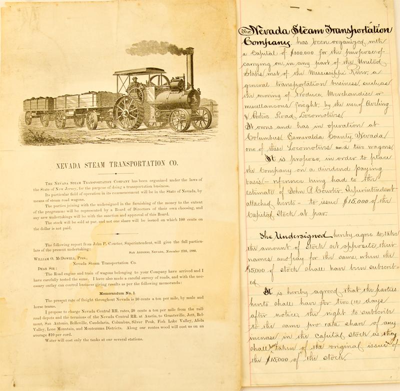 Original 1880 prospectus. It has a vignette of the train on the top, occupying 1/3 of the document page. Possibly unique. Lot of two documents, one printed and the other handwritten. The printed document notes that the company was organized in New Jersey for the purposed of doing a transportation business, particularly in Nevada by means of steam road wagons. There is a wonderful vignette at the top of the page depicting one of these steam road wagons—similar to a locomotive with wheels, hauling two wagons. The document contains a report from John P. Courter, Superintendent, dated November 27, 1880 and addressed to William O. McDowell, President of the company, and regards Courter’s suggestions on some expenditures for the company to undertake in the amount of $85,000. The second piece is a beautifully handwritten document regarding the formation of the company, its purpose, and a proposal to issue $15,000 of the Capital Stock at par to help pay for Courter’s estimates of expenses. It is not signed, although in the body of the document it states, “The Undersigned hereby agree to take the amount of stock set opposite their names and pay for the same, when the $15,000 of stock shall have been subscribed.” The document further states that The company “…owns and has in operation at Columbus, Esmeralda County, Nevada, one of these locomotives and two wagons.” The road locomotives were made by Aveling and Porter, a company well-known among steam enthusiasts. Both documents are 2 pgs. each and measure 8.5 x 14.”