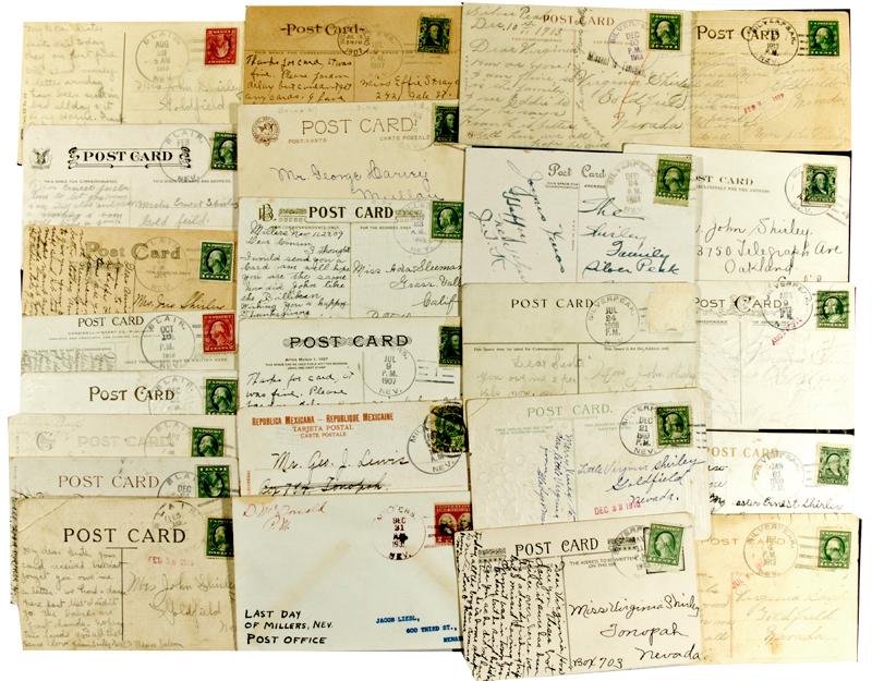 Lot of 36. NV Mining Towns. All with single ring seals. POSTCARDS: Blair, NV (11). Miller, NV (5). Silver Peak, NV. (13). Goldfield, NV (1). COVERS: Miller, NV (2), one cover with enclosed letter handwritten in pencil. Silver Peak, NV (4). All in good condition with a variety of cancelled postage stamps.