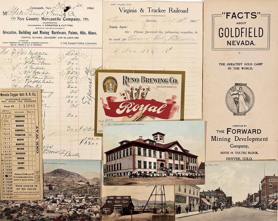 Lot of 11 individual items. 1. Goldfield brochure titled “the greatest gold camp in the world.” Measures 9” x 4”. Produced by the Forward Mining Development Company. Includes information and history on Goldfield. Little wear. 2. Four chromolithograph post cards with no borders. Two show Tonopah, one shows a public school in Carson City and the last shows a Virginia St. scene in Reno. One of the post cards was used and sent to Mrs. Essie Soule in Seattle. Little wear, some corners are bend. 3. Next is a 5”x 3 ½” ad for the Reno Brewing Co. Incorporated. It displays a hand with a royal flush with the caption “It can’t be beat.” 4. Four railroad items. Three are from the Virginia and Truckee Railroad and one is from the Carson and Colorado Railway. Billheads stating the date and items being shipped. All have little wear and creases down the middle. 5. Nevada Copper Belt Railroad and Co. ticket. Measures 6” x 2 ½”. Dated February 14, 1915 for $10.00 one way to Yerington. Some wear on edges. 6. A paper from the State Branch and Trust and Co. to Nye County Mercantile Company showing a list and prices of different oils purchased. Measures 8 ½ x 5 ½”. Has a little wear crease down the center from being folded and a tear in the upper right on the paper.