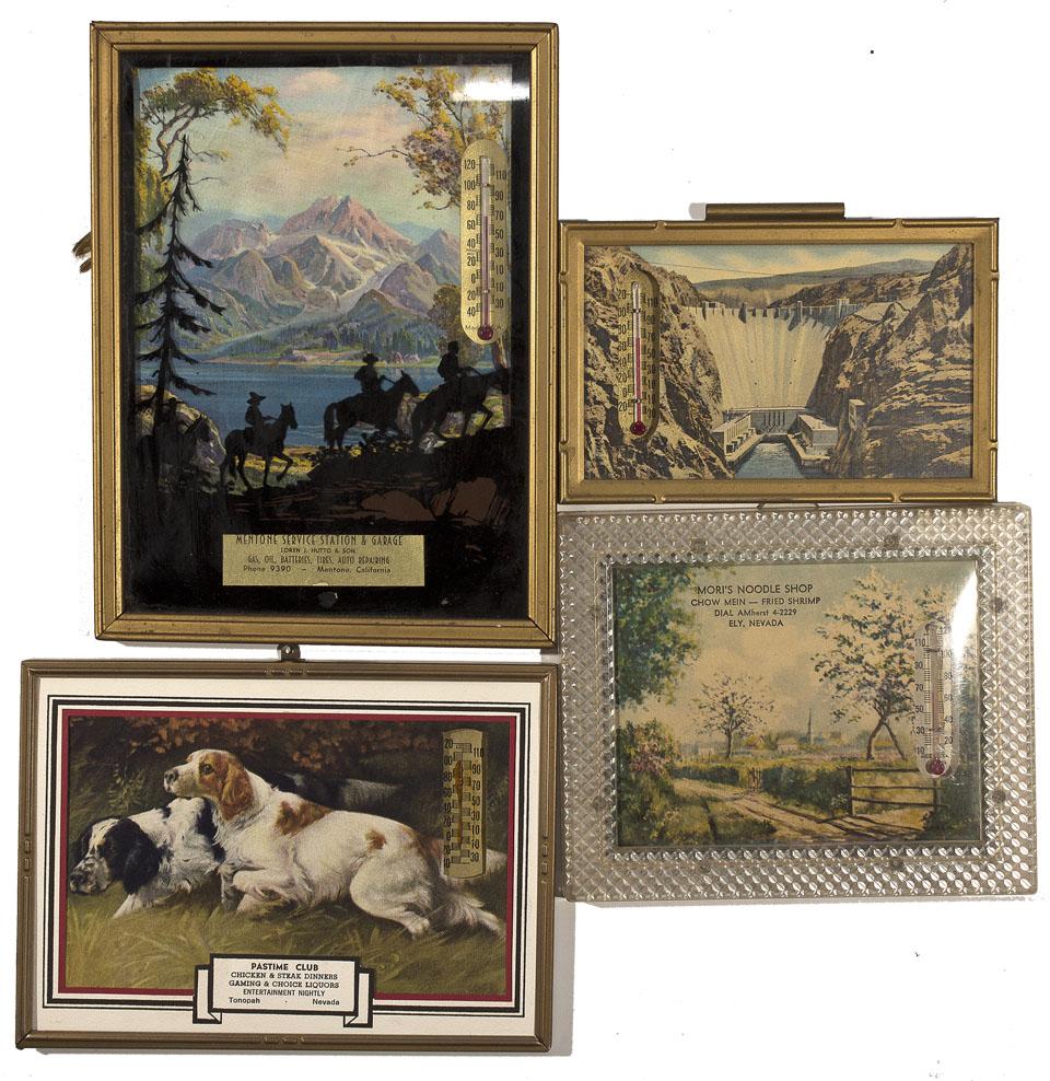 Lot of 4. 1. Mori's Noodle Shop "Chow Mein - Fried Shrimp Dial Amherst 4-2229 Ely, Nevada". Clear plastic frame. Picture of a small town surrounded by grass flowers and trees. Thermometer still in tact to the right of the frame with a small stain next to it. 6" x 5". Overall good. 2. Picture of Boulder Dam. Gold metal frame. Thermometer to the left with a gold background. The back has bent cardboard like material used as a stand. 5" x 3 1/2". Good. 3. Pastime Club "Chicken & Steak Dinners Gaming & Choice Liquors Entertainment Nightly Tonopah, Nevada". Picture of two dogs running through the grass. Thermometer to the right has been removed. The glass that covered the picture and thermometer has been removed as well. Gold frame. On the reverse is a "drop down" full calendar Jan-Dec 1949. 7" x 5". Good. 4. Mentone Service Station & Garage "Loren J. Hutto & Son Gas, Oil, Batteries, Tires, Auto Repairing Phone 9390 - Mentone, California". Picture view of a lake and mountains. Silhouettes of four cowboys on horses along the terrain.  Thermometer to the right in tact under a gold background. Gold frame and ribbon at top. 6" x 8". Very good.