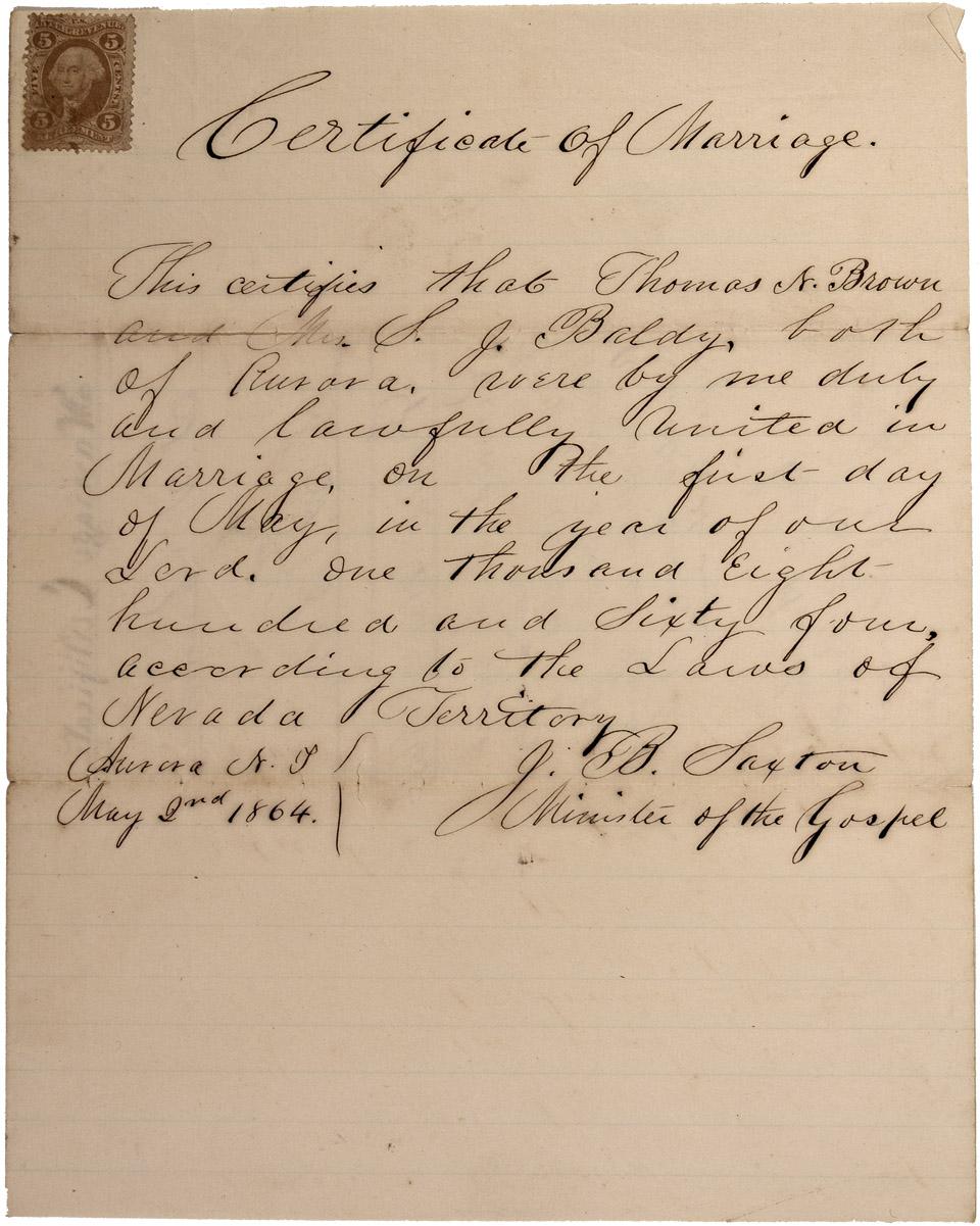 On 1 May Thomas N. Brown and Mrs. S. J. Baldy "were lawfully united in Marriage . . . according to the laws of Nevada Territory." Signed by J. B. Saxton Minister of the Gospel. The marriage was recorded on the 3 of May at 4 PM in Book "A" Miscellaneous Records of Esmeralda County on page 24 by Cyril Hawkins the County Recorder. Brown was the deputy. Written on regular ruled paper and affixed with a faded red, 5 cent, R 23, R 3, perf., Agreement, U. S. Revenue stamp. Rare usage of revenue stamp.