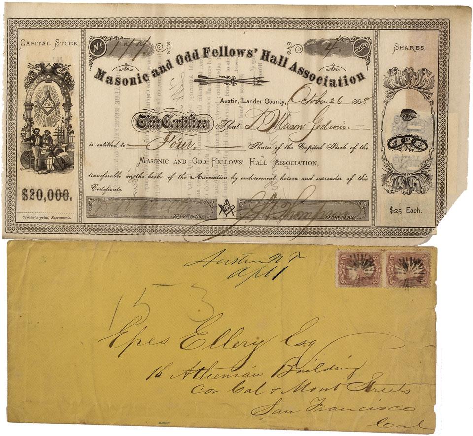 Lot of 2. 1. A bright yellow cover addressed to Epres Ellery Esq., at 16 Athenian Building which was at the corner of California and Montgomery Streets in San Francisco. It has two vertically paired, A 25 three-cent stamps that are perfectly tied. Hand cancelled Austin N. T. Apr 1. Fair condition. 2. Masonic and Odd Fellows' Hall Association Stock Certificate. No. 177 issued to D. Mason Godwin on 26 October 1868 for 4 shares. Attached are 4 adhesive revenue stamps. One is a green 5 cent Nevada stamp. Two are blue Nevada stamps that are imperf., vertically attached. The last is a 25 cent red, Bond R43, R4, U. S. revenue stamp, perf. Some yellowing and the bottom right corner is missing. Good.