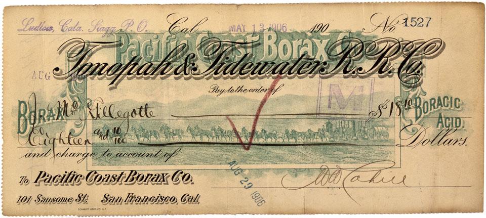Check No. 1527 issued May 13, 1906 payable to J. McGillegotte for $18.10, charge to the account of Pacific Coast Borax Co. 101 Sansome St., San Francisco, Cal. Signed by W.W. Cahill. Printed by Schmidt Litho Co, S.F. 8.5" x 3.75”. Reverse is endorsed and the check is signed over to M.J. Bailey. Aug 29, 1906 stamped on face of the check and there is a large red check-mark in the center. W.W. Cahill was superintendent of the railway at Ludlow.