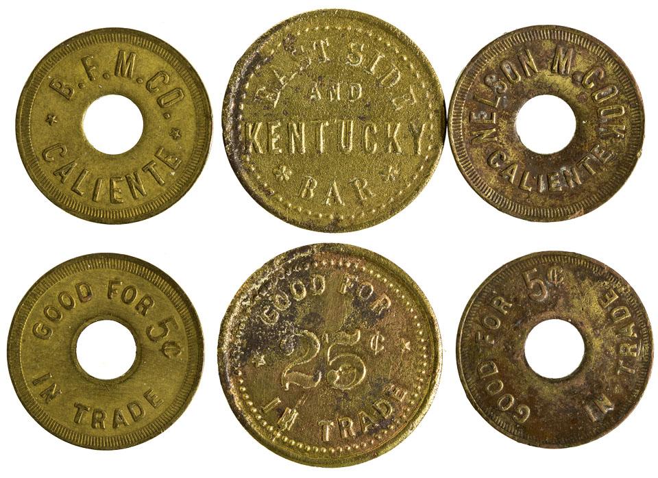 3 different tokens: B. F. M. Co., Eastside and Kentucky Bar, Nelson M. Cook.