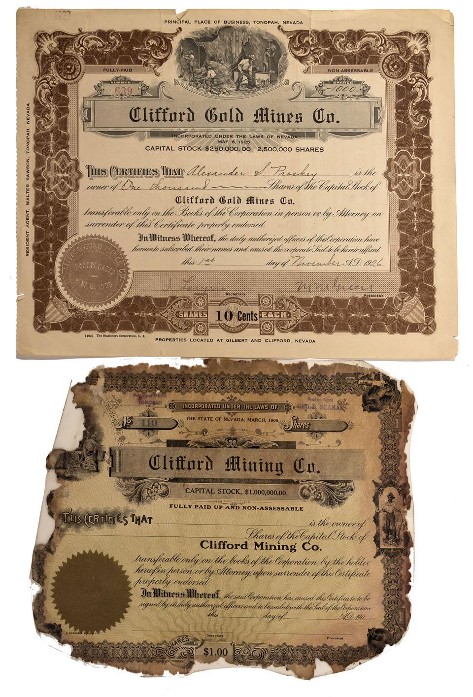 Lot of two. Stock no. 410 is from the Clifford Mining Co. Incorporated under the laws of the state of Nevada. Measures 9 ¾”x 7 ½”. Unissued. Wear all around the stock from being burned, sides are gone. Stock no. 639 is from the Clifford Gold Mines Co. Incorporated under the laws of the state of Nevada. Measures 11 ¼” x 9”. Issued to Alexander S. Proskey on 1 November 1926 for 100 shares. Signed by secretary J. Laryars and president M.M. (illegible). Some wear, tops and sides have a few small tears and two creases.