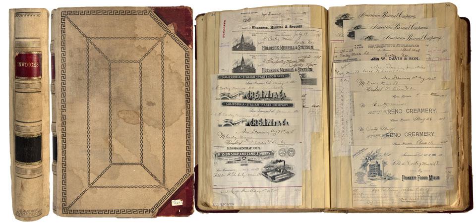 Large ledger book filled with bills of sale from the historic Cortez Mines and Tenabo Mill and Mining Co. Bills are glued to the pages and cover three full years of transacitons for the mining company. Bills include Levi Strauss & Co., Sherwood & Sherwood Importers and Merchants, Haas Brothers Wholesale Grocers, and the Bancroft Company. Most documents are form the San Francisco Bay Area but a few are for the Cortez Mines Ld. Store in Cortez Nevada. All bills of sale are in fine condition. The book has bumps to the corners (in red leather). Spine is tight. Slight water staining to the front and back boards. Boards have decorative black motif borders.