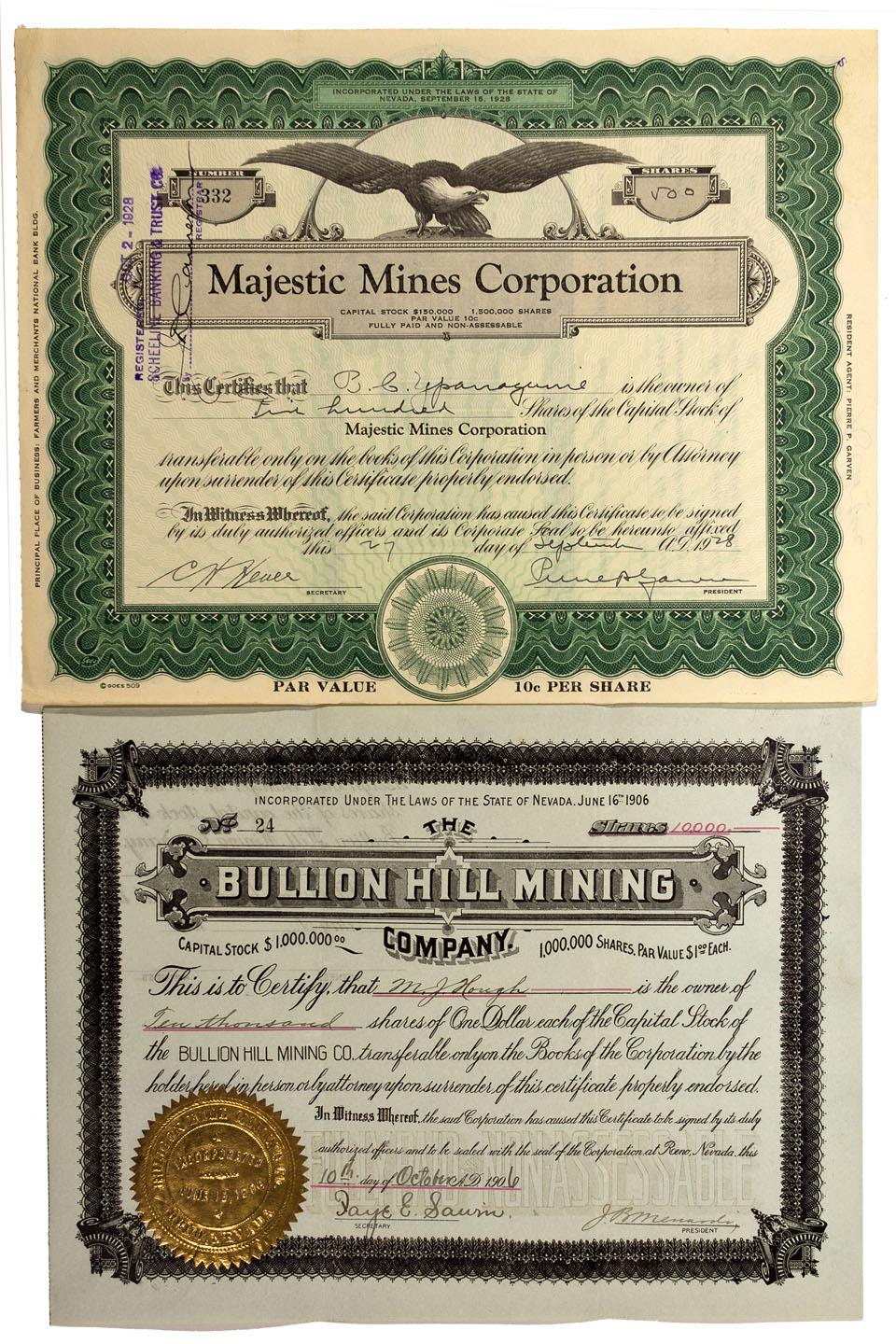 Lot of two. Stock no. 24 is from the Bullion Hill Mining Company. Measures 10 ¼” x 8”. Incorporated under the laws of the state of Nevada. Issued to M.J. Hough on October 10, 1906 for 10,000 shares. Signed by secretary Daye E. Sawn and president J.B. last name illegible. Little wear, slight creases on the stock from being folded in the past. Stock no. 332 from the majestic Mines Corporation. Measures 11 ¾” x 8 ½”. Incorporated under the laws of the state of Nevada. Issued to B.L. last name illegible on September 27, 1928 for 500 shares. Signed by secretary C.H. Heuer and president name illegible. Little wear. Bottom right edge is bent slightly and left side is worn slightly.