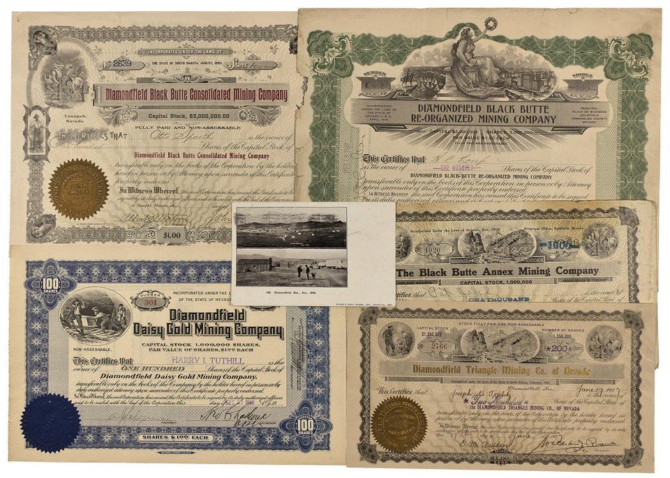 Lot of 6. 1. Photo postcard of Diamondfield, Dec. 1904. On front printed "Miner's Drug Store, Inc., Tonopah, Nev." . Obverse: from Mrs. J. P. Stidgen of Tonopah, Nev. to Mrs. J. P. Newton in Wyoming, PA., Aug. 1908. Postmarked Tonopah and Wyoming. 1 green 1c stamp in top right. 2. Diamondfield Daisy Gold Mining Company stock certificate Number 301 for 100 shares issued to Harry I. Tuthill and signed by illegible and illegible, Dec 29, 1910. Blue decorative border with black text and a vignette of underground miners. Company seal in blue present on bottom left corner. Signed on back. 3. The Black Butte Annex Mining Company stock certificate No. 1020 for 1,000 shares issued to Pat Jaye and signed by Edw. I. Patuer and J. L. (illegible), Nov. 27, 1906. Black decorative border with three vignettes, one of 3 underground miners, one of a mill and river and one of 4 underground miners . Company seal in bottom left corner. Obverse: 3 green 1c postal stamps. 4. Diamondfield Triangle Mining Co. of Nevada stock certificate No. 2766 for 200 shares issued to Joseph B. Tophtz and signed by E. McFadden and (illegible), June 17, 1907. Black decorative border with three vignettes, one of 3 underground miners, one of a mill and river and one of 4 underground miners . Company seal in bottom left corner. Signed on back. 5. Diamondfield Black Butte Re-Organized Mining Company stock certificate Number C672 for 100 shares issued to H. C. Laup and signed by (illegible) and H. C. Clapp, Oct. 18, 1912. Green border with black text and a large vignette of lady liberty, a city and a harbor. Company seal in bottom center above "corporate seal". Signed on back with 6 assessment stamps, 1-4 and 6-7. 6) Diamondfield Black Butte Consolidated Mining Company stock certificate No. 2639 for 100 shares issued to Otto Spaeth and signed by Albert I. Watson and John (illegible), Feb. 2, 1906. Black decorative border with 6 vignettes of miners and 1 large vignette of 4 underground miner. Company seal present on bottom left corner. Signed on back.