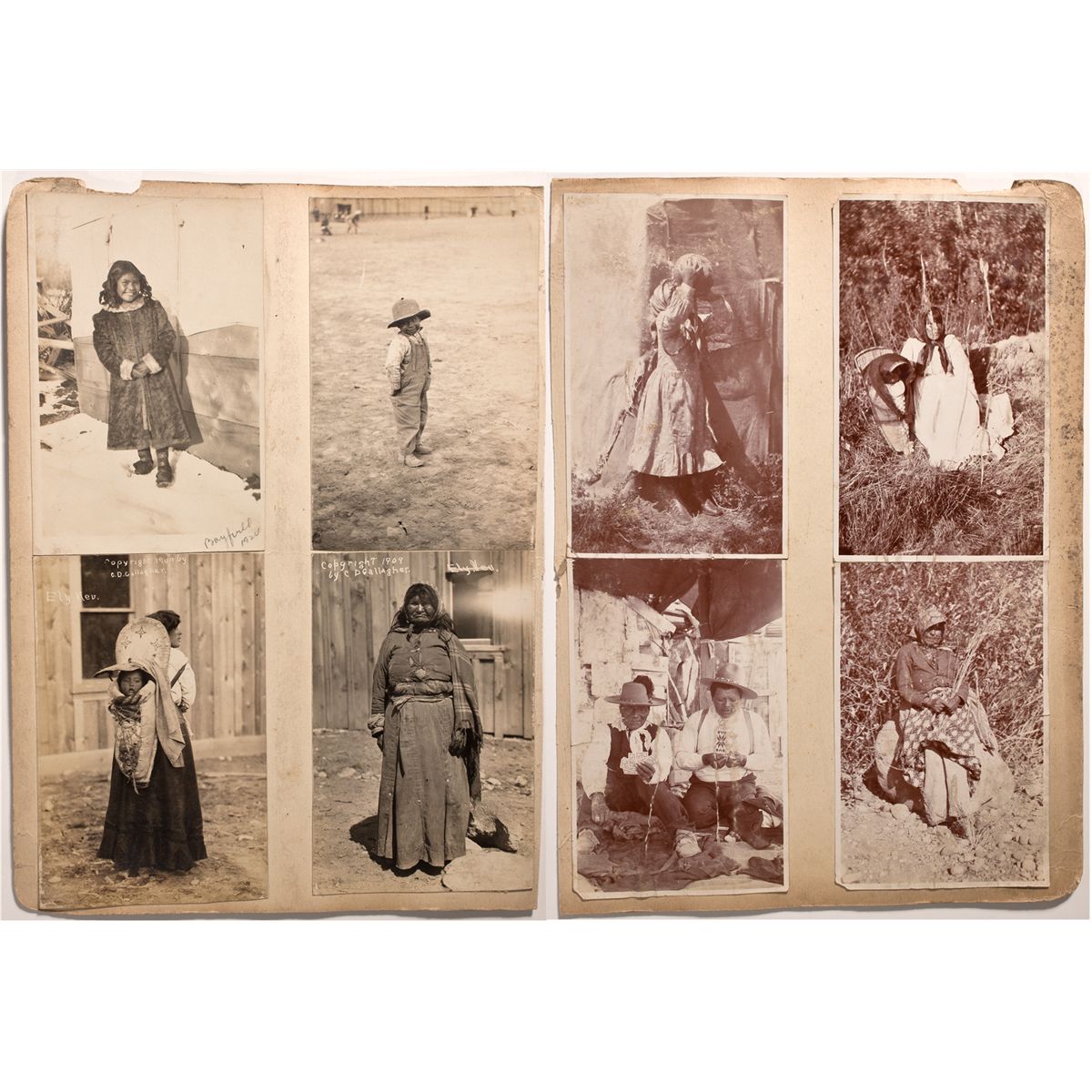 Lot of 8 photographs measure 3.35” 5.25” and 11” x 8” mounted on white matte, 4 photographs on each side. Low to medium contrast and focus is sharp on almost all of the photos. There are some wear on the photographs, 4 have light damage, and creases. The other 4 have little wear. The matte has wear and tears. 2 photographs were produced by C.D. Gallagher in 1909 in Ely, Nevada, one shows an elderly woman stand posed for a photo. The other is of a woman and her child. There are 3 photos of small children, dated around 1920. 1 photo shows 2 men playing a card game. 2 more photographs are of an elderly woman and a mother and small child. The Native Americans pictured appear to be either Northern Paiute or Western Shoshone. - Vinegar Collection