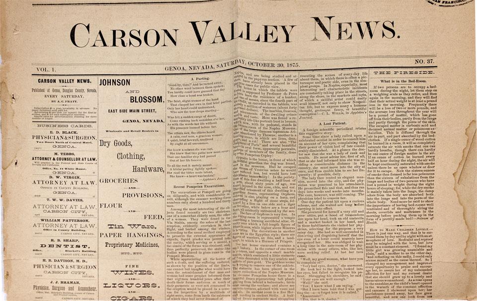 The Carson Valley News was founded by A.C. Pratt on February 20, 1875 at Genoa. It was originally a Friday edition but eventually became semi-weekly. It was a twenty-four column paper with a Republican party (of Lincoln) outlook. The paper was closed for financial reasons on July 16, 1880. [Lingenfelter, Richard E. and Karen Rix Gash. The Newspapers of Nevada: A History and Bibliography 1854-1979. Reno: University of Nevada Press, 1984. p. 91-2]