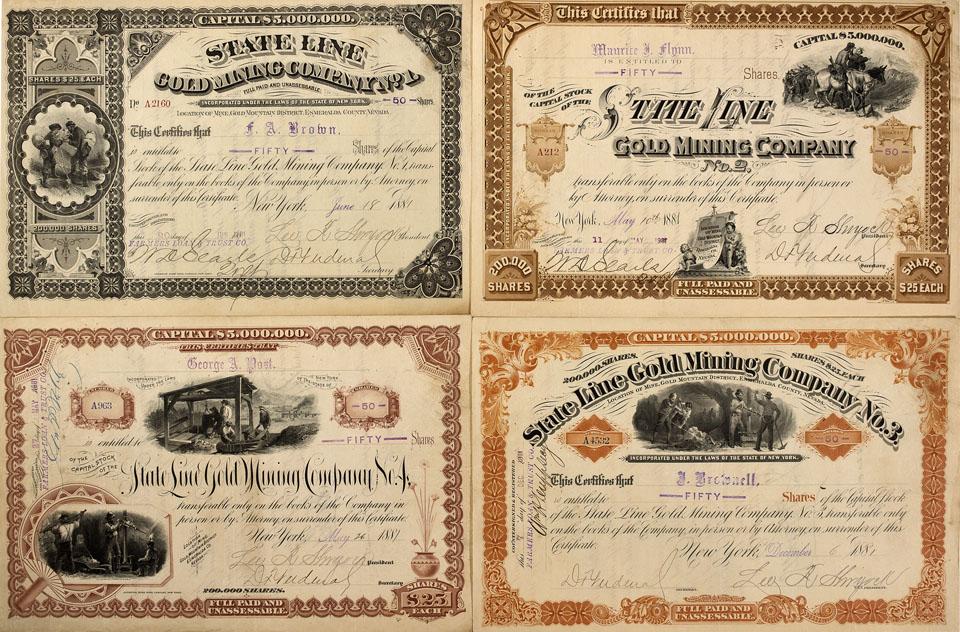 Lot of 4. 1) State Line Gold Mining Company No. 4; Incorporated in New York; Certificate No. A963 issued May 26, 1881 to George A. Post for 50 shares; signed by Lee. R. Shryock, President and D.F. Verdenal, Secretary; printed by American Bank Note Company, N.Y.; U/C. Endorsed on reverse. 2) State Line Gold Mining Company No. 3; Incorporated in New York. Certificate No. A4532 issued December 6, 1881 to G. Brownell for 50 shares. Signed by Lee R. Shryock (?), Vice President and D. F. Verdenal, Secretary. Printed by American Bank Note Company, N.Y. Not cancelU/C on reverse. 3) Tate Line Gold Mining Company No. 2; Incorporated in New York. Certificate No. A212 issued May 10, 1881 to Maurice J. Flynn for 50 shares. Signed by Lee. R. Shryock, President and D.F. Verdenal, Secretary. Printed by American Bank Note Company, N.Y. U/C. EndorU/Ce. 4) State Line Gold Mining Company No. 1. Incorporated in New York. Certificate No. A2160 issued June 18, 1881 to F.A. Brown for 50 shares. Signed by Lee R. Shryock, President and D.F. Verdenal, Secretary; printed by American Bank Note Company N.Y. Not cancelU/C on revU/C