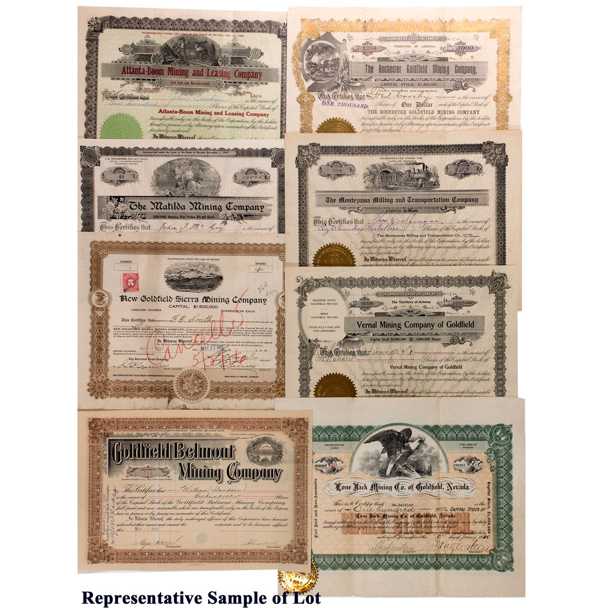 Lot of 14. 1) Orizaba Mining and Development Co. Incorporated in Nevada, Feb., 1915. Cert. #1530 issued May, 1921 to A.V. Romianik for 5000 shares. U/C. Signed by President Rm. Barbour and secretary [illegible]. 2) The Goldfield Bull Dog Mining Co. Incorporated in Arizona. Cert. #1084 issued April 23, 1906 to George H. Anders for 300 shares. U/C. Signed by Secretary A.E. Tillin and President Guy Le R Stevic. 3) Goldfield Belmont Mining Co. Incorporated in Delaware. Cert. #784 issued Mar. 2, 1906 to William Davidson for 100 shares. U/C. Signed by Secretary Clyde Hewer and President John Mort. 4) United Tonopah & Goldfield Mines. Incorporated in Arizona, Mar. 14, 1905. Cert. #5201 issued Feb. 15, 1906 to Delbert Searles for 2000 shares. Signed by Secretary G. Holste and Geo. [illegible]. Slight crease and edge tears. 5) Baltimore Belle Mining Co. Incorporated in Nevada. Cert. #229 issued May 24, 1909 to Richard Pleasants for 1000 shares. Signed by Secretary J.E. Wilson and President W.K. Williamson. U/C. 2 punches at left. 6) Gotwaldt Combination Mining and Leasing Co. Incorporated in Nevada, 1908. Cert. #313 issued Aug. 18, 1908 to W. Downing, trustee for 1000 shares. Signed by Secretary J.D. Van Devort and Vice President Wm Gotwaldt. U/C. 7) Nevada-Arizona Mining and Development Co. Incorporated in Nevada, 1923. Cert. #3 issued Aug. 28, 1923 to the company for 500,000 shares. Signed by Secretary C.C. Robinson and President T.A. Mills. U/C. 8) The Rochester Goldfield Mining Co. Incorporated in Arizona. Cert. #1254 issued March 12, 1908 to Fred Crosby for 1000 shares. Signed by Secretary R. J. Shoemaker and President J.D. MacMaster. U/C. 9) The Montezuma Milling and Transportation Co. Incorporated in Arizona. Cert. #708 issued April 15, 1910 to J.C. Sprague for 833 shares. Signed by Secretary Thos. L. Williams and Vice President H.H. McCulloch. U/C. 10) Vernal Mining Company of Goldfield. Incorporated in Arizona. Cert. #2028 issued Jan. 16, 1912 to Finninger & Co. For 100 shares. Signed by Secretary D.D. Dewey and President Edw. Van Dyck. 11) New Goldfield Sierra Mining Co. Incorporated in Nevada. Cert. #4 issued May 15, 1915 to F.E. Smith for 1 share. Signed by Trust Officer L.C. Greenlee, President S.R. Riedel, and Secretary H.E. Smith. One rose stamp tied R200 R20 semi perf adhesive stamp at left. Cancelled. 12) The Matilda Mining Company. Incorporated in Nevada, Dec. 7, 1907. Cert. #40 issued Dec. 26, 1926 to John T. McCoy for 12,500 shares. Signed by Secretary M.A. McGuire and President J.H. Houlahan. U/C. 13) Atlanta-Boom Mining and Leasing Company. Incorporated in Nevada, Nov. 27, 1906. Cert. #299 issued Aug. 13, 1907 to John Erickson for 100 shares. Signed by Secretary J. Prescott Dyos (also the Resident Agent) and President Richard Whiteside. U/C. 14) Lone Jack Mining Co. of Goldfield, Nevada. Incorporated in Arizona. Cert. #459 issued Jan. 3, 1910 to Wm. Seidler for 100 shares. Signed by Secretary S. Katzenstein and President D. Katzenstein. Goldfield suffered from a number of mining strikes early in its development. Disputes were over wages, change rooms, and script. "Threats of violence in December 1907 moved Governor Sparks to call in federal troops though local authorities had not collapsed" [Paher, Nevada Ghost Towns and Mining Camps, 1973, p. 386]. Goldfield also suffered from a devastating flood in 1913 and then a fire a decade later. The fire destroyed over 53 square blocks [Paher, Nevada Ghost Towns and Mining Camps, 1973].