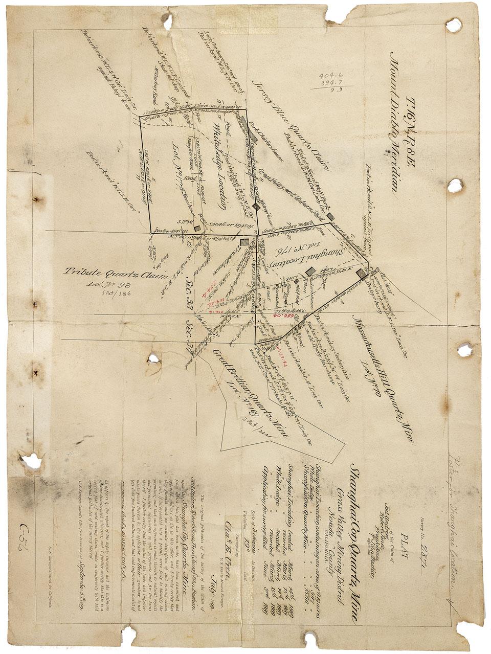 Map of Shanghai Con. Quartz Mine, Grass Valley Mining District, Nevada County, California. On the "T. 16 N., R. 8 E. Mount Diablo Meridian." Measures 18" x 13", repaired with tape, one hole near center and several noted along each edge. Areas highlighted include the Massachusetts Hill Quartz Mine (Lot No. 70), the Great Brittian Quartz Mine (Lot No. 169), the Tribute Quartz Claim, the White Ledge Location (Lot No. 177), Jersey Blue Quartz Claim, and the Shanghai Location (Lot No. 176). Survey No. 2871, displays the "Plat of the Claim of Joel Andrew, Robert Jones, Frank jones, and John Bastian. Performed by Chas. E. Uren, U.S. Deputy Mineral Surveyor, dated July, 1989. Records the number of acres and date located and recorded for the Shanghai and White Ledge Locations.