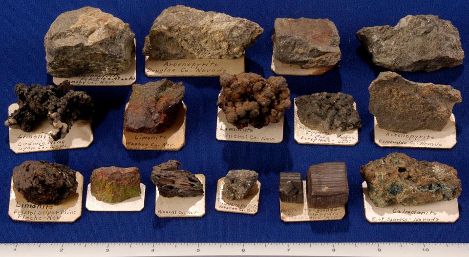 Lot of 14. One to 3 cubic inches. 1. Arsenopyrite from Esmeralda County. 2. Arsenopyrite from Grant Mountains, Nye County. 3. Arsenotpyrite from "Ormsby" County. 4. Mineral Co. Specimen. 5. Limonite from Mineral Co. 6. Limonite from Washoe County. 6. Arsenopyrite from Douglas County. 7. Limonite from the Bristol Silver Mine in Pioche. 8. Coladonite from east of Sparks. 9. [ . . . ] Pseudo [. . . ] Silverzotic. 10. Arsenopyrite from the Union Lode in Washoe County. 11. Limonite from the Ludwig Mine in Lyon County. 12. Limonite from Washoe County. 13. Arsenopyrite from Washoe County. 14. Pyrite from Washoe County.