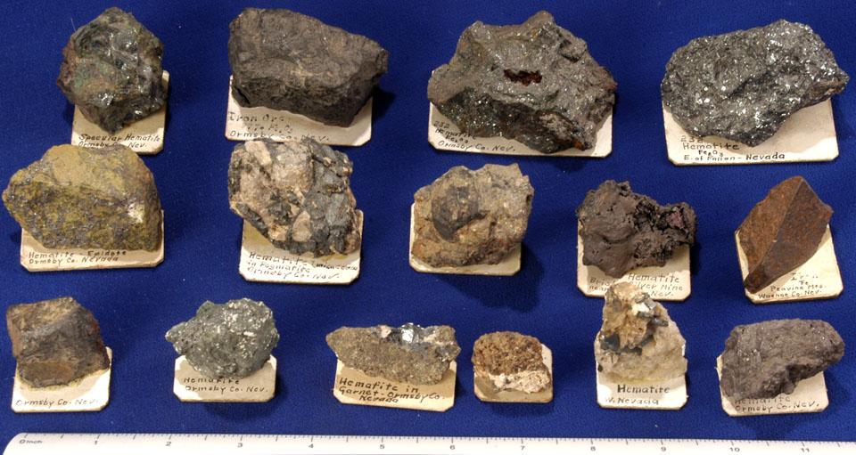 Lot of 23 iron specimens from various historic districts in Nevada including Ormsby County, Pioche, Duckwater, and Virginia City. Specimens range in size from 3 x 3 cm to 7 x 4 cm and are predominantly iron ores which include hematite and magnetite. Notable samples include a piece of specular hematite with malachite from Ormsbo County, coarsely crystalline vivianite from Ruth, Nevada, and a piece of black crystalline hematite with metallic lavender and blue alteration.