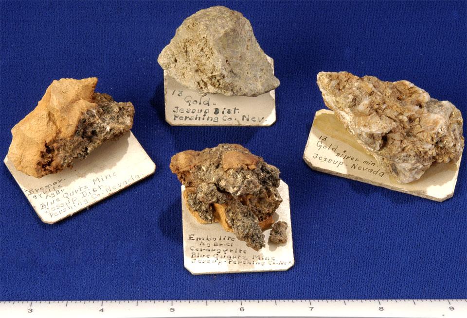 Lot of 4 gold and silver ore specimens from Jessup, Nevada. These samples contain visible gold and the silver ore minerals embolite, cerargyrite, and bromargyrite. Sizes range from 5 x 3 cm to 5 x 4 cm.