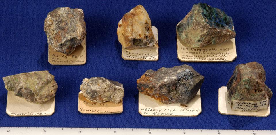 Lot of 7. Ore minerals include cerargyrite, argentite, anglesite, proustite, and pyrargryite. Sizes range from 3 x 2 cm to 5 x 2 cm.