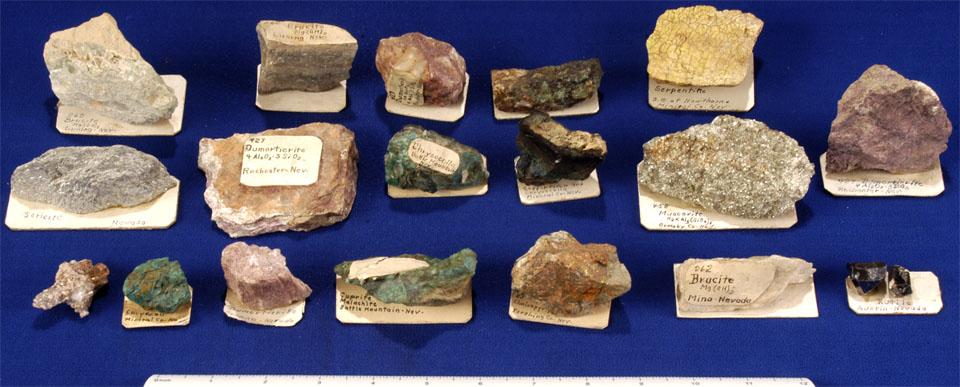 Lot of 18 miscellaneous mineral species from all over Nevada. Localities include Austin, Ormsby County, Rochester, Battle Mountain, Pioche, Luning, and Yerrington. Specimens include dumortierite, chrysocolla, serpentine, rutile, topaz, cuprite, chalcopyrite, muscovite, sericite, and brucite. Notable specimens include three euhedral rutile crystals each 1 x 1 cm and euhedral topaz crystals up to 2 cm long.
