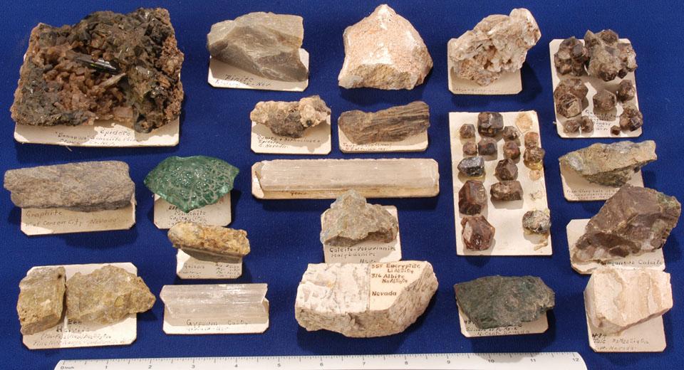Lot of 39, Nevada Mineral Specimens. Specimens ranging from small (1cm x 1cm) to large (around 5 inches in length by several inches in thickness). Although there are many items in this lot, specimens that are quite noteworthy are as follows: a 5” long specimen of Gypsum- a stone that was used decoratively in ancient Egypt. Gypsum is a common mineral found in large bands of sedimentary rock; this sample is transparent, and has sleek cleavage; a large Epidote sample from the Bonanza Scheelite Mine. Epidote is an abundant rock forming mineral which occurs in marble, schistose and is of metamorphic origin; an emerald colored piece of malachite (2” x 2”)- malachite is a carbonate mineral, it often results from weathered copper ores. Large quantities have been found in Russia, parts of Africa, Mexico, Australia and in Arizona.