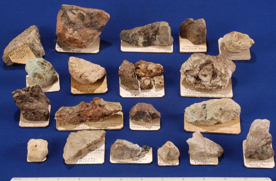 Lot of 19 specimens from a myriad of areas in Nevada. The specimens contain scheelite, powellite, wolframite, garnet, beryl, marmatite, sneelite, stromeyerite, ferberite, tactite, epidote, and/or scwheelite. They were found at the following sites: Mass. Tung. Co., Isanhood District, Eureka County, Oreona, N. Central NV, Pine Nut (Ormsby County), Rocky Canyon, 12 miles east of Dayton, Round Mountain, Tempiute, Grant Mountain, Bay State Mine (White Pine County), Red House District (Lander County), Mill City, and the Douglas/Ormsby County line. This is a diverse collection of specimens from the diverse geography of Nevada. The specimens range in size from 1" to 3" in diameter and vary in mineral composition and color.