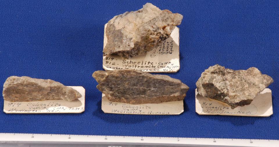 Lot of 4 specimens from Nevada containing Scheelite. One specimen is from the Cowboy Mine in Lyon County and contains Calcite, Quartz, Garnet, and Epidote. The other three specimens are from the Wellington, NV area.