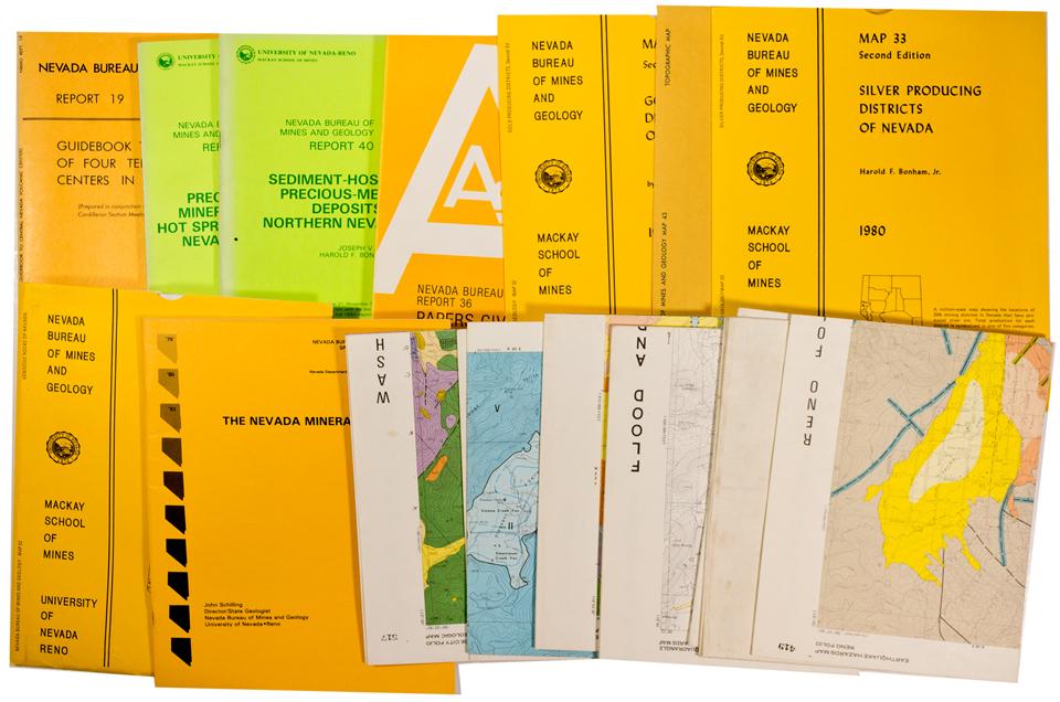 Lot of 30 pamphlets related to Nevada geology. Pamphlets are both soft cover or spiral bound. Also included are two folders of maps. 1. Nevada's Metal and Mineral Production, November 1, 1943. 2. The History of the Comstock Lode, 1850-1920, July 1, 1943. 3. Placer Mining in Nevada, 1976. 4. An Analysis of Nevada's Metal Bearing Mineral Resources, 1996. 5. Geology and Mineral Deposits of Lyon, Douglas, and Ormsby Counties, Nevada, 1969. 6. Geology and Mineral Deposits of Lyon, Douglas, and Ormsby Counties, Nevada, 1969 (second copy). 7. Geology and Mineral Deposits of Esmeralda County, Nevada, 1972. 8. Erionite and Other Associated Zeolites in Nevada, 1972. 8. Geology and Mineral Deposits of Churchill County, Nevada, 1974. 9. Outline of Nevada Mining History, 1964. 10. Papers Presented at the AIME Pacific Southwest Mineral Industry Conference, Sparks, Nevada, May 5-7, 1965, 1966. 11. Geology and Mineral Deposits of Washoe and Storey Counties, Nevada, 1969. 12. Turquoise Deposits of Nevada, 1968. 12. Guidebook to the Geology of Four Tertiary Volcanic Centers in Central Nevada, 1974. 13. Precious-Metal Mineralization in Hot Springs Systems, Nevada-California, 1986. 14. Sediment-hosted Precious-Metal Deposits of Northern Nevada, 1984. 15. Papers Given at the Precious-Metals Symposium Sparks, Nevada November 17-19, 1980, Nevada Bureau of Mines and Geology Report 36, 1983. 16. Gold Producing Districts of Nevada, 1976. 17. Mineral Resources of Northern Nye County, Nevada, 1984. 18. Silver Producing Districts of Nevada, 1980. 18. Topographic Map of Nevada, 1972. 19. Cenozoic Rocks of Nevada, 1976. 20. The Nevada Mineral Industry, 1981. 21. Directory of Nevada Mine Operations Active During Calendar Year 1987, May 1988. 22. Nevada Index to Topographic and Other Map Coverage. 23. Nevada Catalog of Topographic and Other Published Maps, June 1989. 24. Nevada Index to Topographic and Other Map Coverage. 25. Miscellaneous Carson City and Reno maps. 26) Nevada topographic maps. 27. Transmission and Transportation Facilities in Nevada, 1970. 28. Turquoise Depositis of Nevada, 1968 (second copy). 29. Major Mines of Nevada 1997, 1998. 30. See Nevada First, 1954.