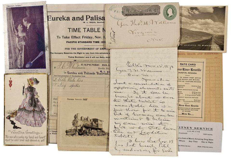 Lot includes following: 1. Wells Fargo cover containing 2 letters sent from Elko to Virginia, Nev., dated July 26 and Mar. 15, 1874. Postmarked July 27, 1874. "Paid, Wells Fargo & Co., Over Our California and Coast Routes" printed at top center of cover. Addressed to General Thos. Williams and regards political matters. The author mentions the need of an unbiased newspaper to report political matters, stating that the current paper is owned by the Governor's son (John Bradley). "This John Bradley is a Thornton candidate for the state senate." The author asks for assistance to fund his campaign, stating that he is "in it for the fight" and that he is "too poor" to get a thorough campaign system in place. 2) White border RPC showing highway fading into the background, with "U.S. Lovelock to Winnemucca, Nev. 19" printed in white at center-bottom right. 3. "Eureka and Palisade Railroad, Time Table No. 34. to Take Effect Friday, Nov. 1, 1901, at 1 a.m. (M.L. Requa, Receiver). Expense Bill No. 18062, datelined Eureka, Nov. 27, 1901. To Eureka and Palisade Railroad Company, Dr., for $3.28. Stamped by both agent and receiver (Requa, M.L.). RPC of locomotive pulling cars lining up into the distance. Medium contrast and good focus, mounted on cardstock. "Eureka Nevada #119" typed at upper left corner of matte. Typed on reverse, "Scrapped in S.F. On Nov. 16, 1938. H.K. Porter." 4. Rate Card for the Reese River Reveille, Austin. "Goes to Every Post Office in the Ranch and Mining Country of Eastern Nevada. The Reese River Reveille is Published in One of the Richest Ranch and Mining Sections of Nevada." 5. Business card from "Jitney Service, J.E. ST. CYR. Fallon - - Nevada. Stand Phone 501 Res. Phone 13X1. 6. Blank receipt #44 from H.E. Scott. Groceries, Meats and Hardware. Datelined Rawhide, Nev., 191_." Printed by Charles R. Hadley Company Manufacturers, Los Angeles. 7. "Spooners Delight" PC, copyright 1908 by J. Thomas. Postmarked Nev, addressed to Frisco, Cal. 8. Artistic Valentine Greetings card, postmarked Feb 12, 1920, Gerlach.