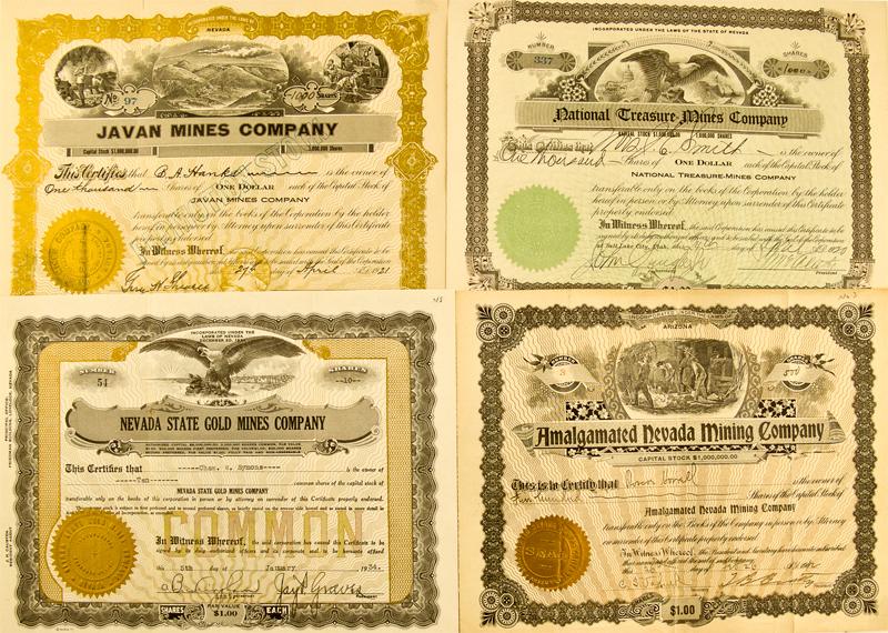 Collection of 4. 1)Amalgamated Nevada Mining Company. Five hundred shares to Roscoe Howell on 28 February 1912. Signed by the Secretary and President. Vignette of Miners in the center. Gray border. Gold seal. Incorporated in Arizona. Has two folds. Good Condition. 2) National Treasure Mines Company. One Thousand shares to Mrs. J. E. Smith on 24 April 1920. Signed by the President and Secretary. Vignette is the American Bald Eagle. Incorporated in Nevada. Gray border. Green seal. Good condition. No folds. 3)Javan Mines Company, Promotional stock certificate. No. 97 for 1,000 shares to B. A. Hanks on 27 April 1921. Signed by the Secretary only. Three vignettes. Left is of two miners. Middle is the mountains. Right depicts several miners and ore cars. Incorporated in Nevada. Has two folds. Gilt edges. Gold seal. Good condition. 4) Nevada State Gold Mines Company. No. 54 for 10 shares. Chas. W. Symons on 5 January 1934. Signed by ? Buckingham, Asst. Secretary and Jay P. Graves, President. Incorporated in Nevada in 1931. Vignette of the American Bald Eagle with wings spread open. Gray and gilt border. Gold seal. Two fold lines, but in great condition.