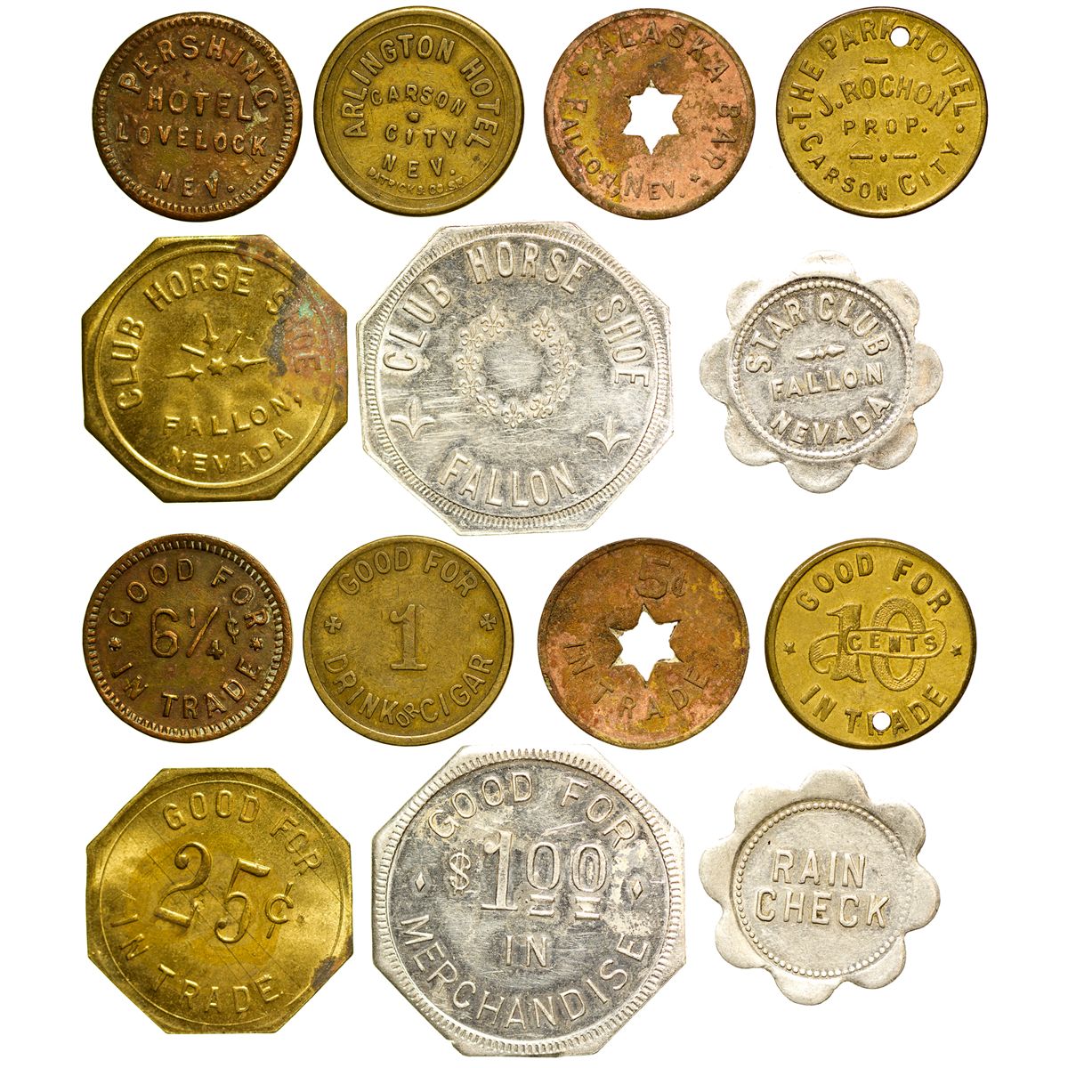 Lot of 7. Fallon, NV: 1) Star Club, scalloped rain check. XF. 2) Alaska Bar. 5cIT. Corroded. 3) Club Horseshoe. GF25cIT. Some corrosion. 4) Club Horseshoe. GF$1IM. AU-Unc. Carson City, NV: 5) The Park Hotel. GF10cIT. Holed, VF. 6) Arlington Hotel. GF1 drink or cigar. Fine. Lovelock, NV: 7) Pershing Hotel. GF6 1/4IT. Fine. Lovelock, NV lies in Pershing county.