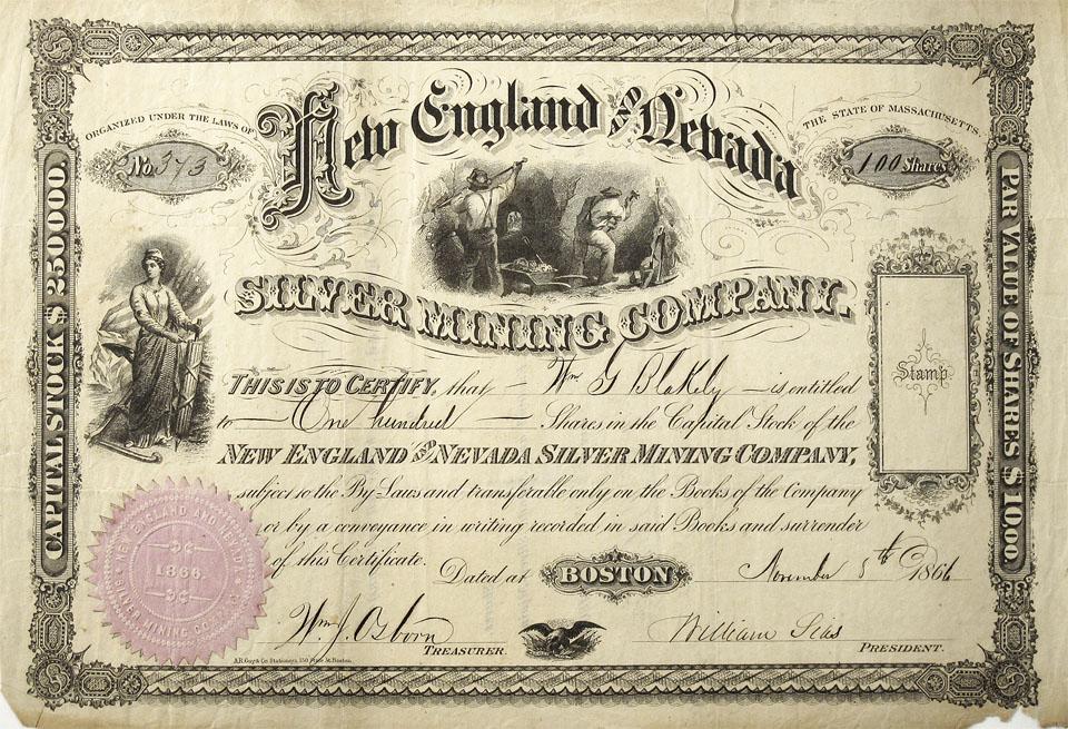 Measures 11" x 7 1/2". Incorporated in 1866. No. 373 issued to Blakely for one share at $100.00 each and signed by the treasurer and president of the company. Underneath the title is a picture of two miners, and to the left is another with the American flag in the background. Small tears around the edges, with minor yellowing near the bottom half and gray stains at the top, fair.