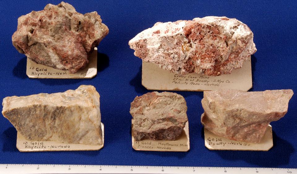 Lot of 5 ore specimens, some with visible gold. Bullfrog Mining District. Samples include visible gold, in a matrix of anglesite, kaolinite, limonite, and goethite within box work textured quartz from the Curley Carr mine, near Beatty,; gold and cerargytie in quartz from the Mayflower Mine; quartz breccia ore lacking visible gold; and two samples from Rhyolite, NV, just outside of Death Valley - one with visible gold and tenantite in quartz, and the other with visible gold, cerargyrite and hematite in crystalline quartz. Samples range from 1 to 2 inches in diameter.