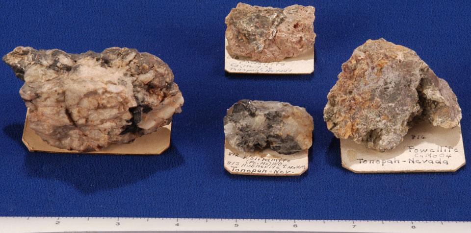 Lot of 4 specimens from the Nye County area. These specimens contain wolfamite, powellite, and scheelite. Two are noted to have been found in Tonopah. The group ranges in size from 2.5" to 3.5" in diameter. The largest specimen has scheelite, wolfamite, and hubernite, which because of this, strong color variation is evident specifically on the facing side.