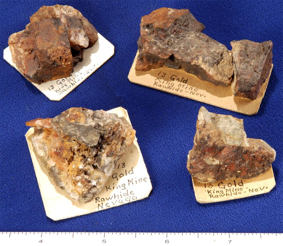 Lot of 4 gold ore specimens from the King Mine. Mining began in Rawhide in 1908 and by 1940 it had produced just under $1 million worth of gold, silver, copper, and lead. These samples contain visible gold hosted in quartz. Sizes range from 3 x 3 cm to 4 x 3 cm.