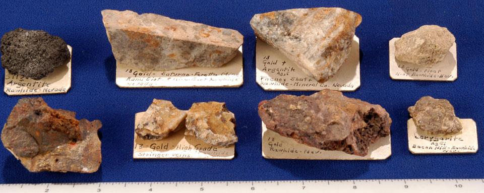 Lot of 8 gold bearing ore specimens. Collection locations include Bacon Hill, the Phoenix Shaft, and the Saturno-Ferretta Mine. Specimens show multiple mineral associations with visible gold including gold in argentite, gold in siderite and bull quartz veins, gold within iron oxide boxworks, gold from float, massive argentite, and gold within cerygarite.