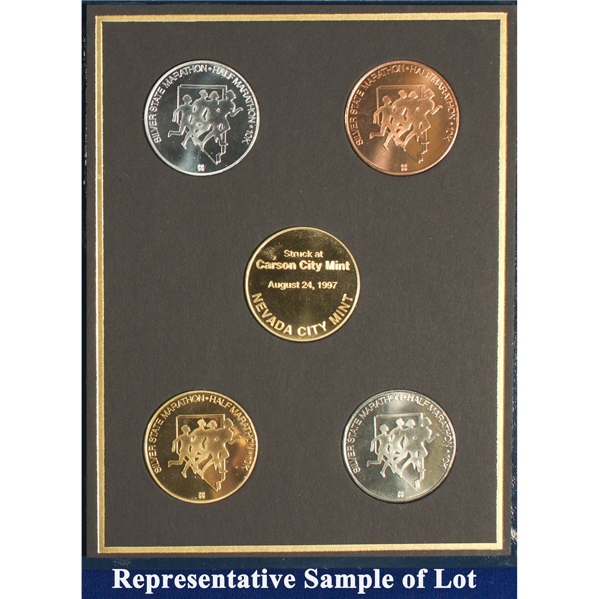 Four medals from the August 24 half-marathon race. Gold plate, silver, bronze and nickel. Blue folder. Sponsored by the Nevada City Mint and struck by the Carson City Mint.