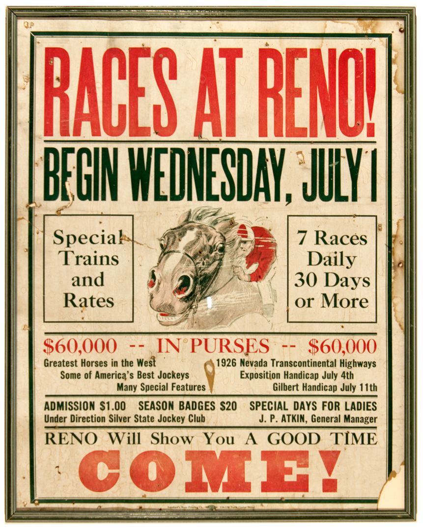 Besides horse and auto racing, the celebration also included the dedication of Reno’s signature arch. This framed broadside measures about 22"x 28". There is some staining and a few tears, but generally, it’s a nice piece of Americana and should be remounted and framed.