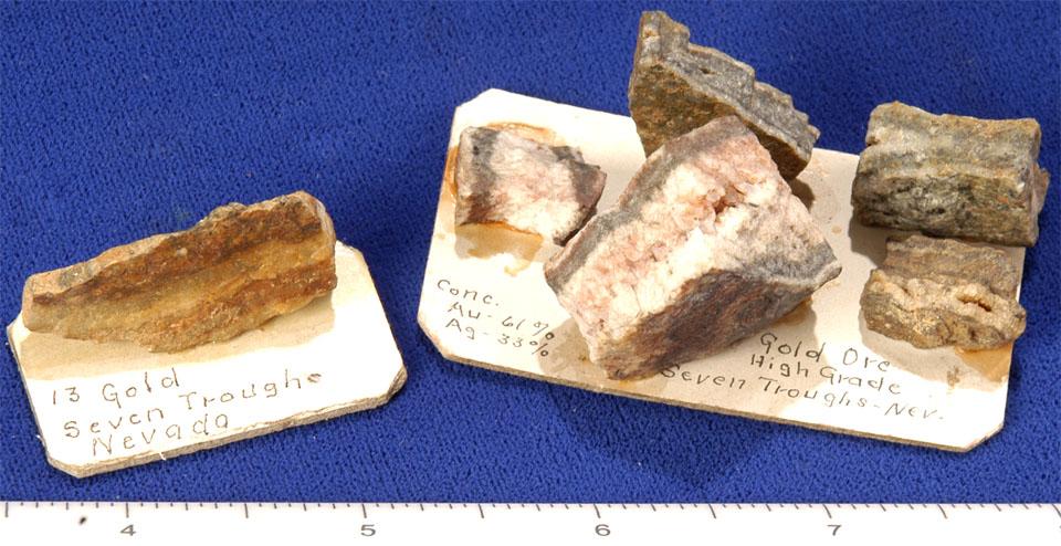 Lot of 10 gold ore specimens. Seven Troughs produced over $2 million worth of gold from 1908 to 1921. These samples contain native gold and electrum hosted in massive quartz. Sizes range from 2 x 1 cm to 9 x 5 cm.