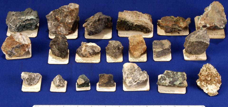 Lot of 20 silver and copper ore samples from various historic districts in Nevada and Utah including the Blumel District, Pioche, Butte, and the Sawtooth District. Mounted specimens range in size from 2 x 2 cm to 7 x 5 cm. Silver bearing minerals include acanthite, pyrargyrite, cerargyrite, and stephanite. Copper minerals include malachite, brochantite, and chalcocite. There is an especially nice sample with euhedral quartz crystals, coarse-grained octahedral pyrite, and malachite from Butte, Montana.