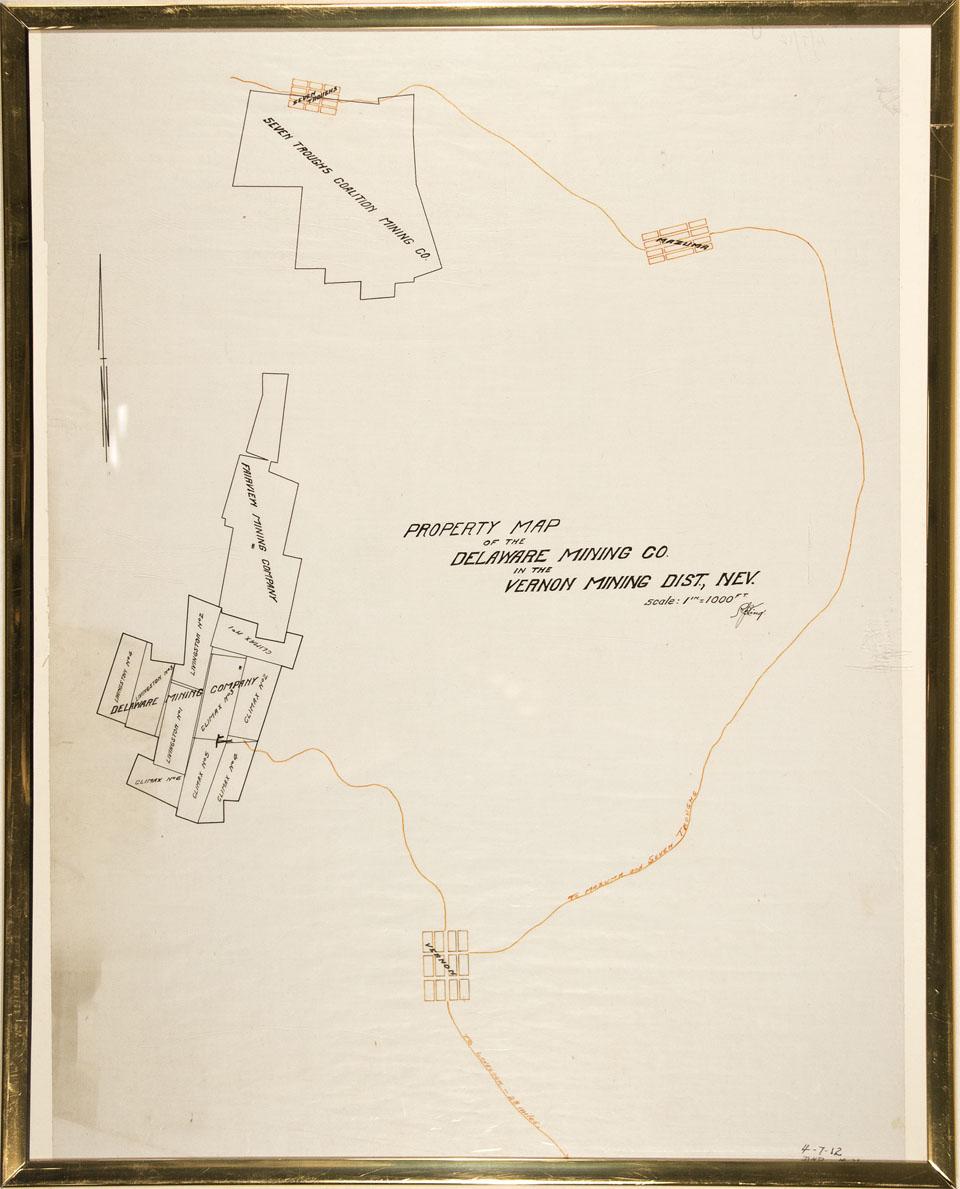 Map of the Delaware Mining Company in the Vernon Mining District, Vernon Nevada nestled in Pershing County north of Lovelock. The map displays three primary mining companies: the Seven Troughs Coalition Mining Company (located near Mazuma), the Fairview Mining Company, and the Delaware Mining Company. The map also shows three primary roads heading to and from Vernon. The first is main road from the town to the mining companies, the second heads to Lovelock (map indicated 28 miles away), and the third heads to Mazuma and Seven Troughs. The map is drawn on the Scale of 1” = 1,000 feet. Vernon was established in 1905 to host employees who worked in the Seven Troughs Mines. The Vernon and Seven Troughs Mining Districts’ production declined heavily within the next 5 years and by 1918 there were so few people left, the post office closed and most dwellings were either demolished or relocated to the “Tunnel Camp” nearby.