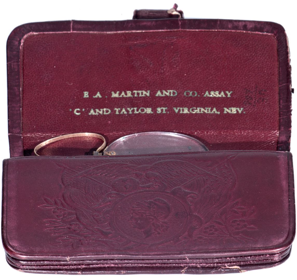 Leather wallet with tooled frontpiece. The illustration is a lovely liberty head facing left, below a patriotic eagle with American flags on either side. The cover is embossed E.A. Martin and Co. Assay `C` and Taylor St. Virginia Nev. Four compartments with an antique monicle in one. The wallet measures 4 x 2.5. HKA#63300