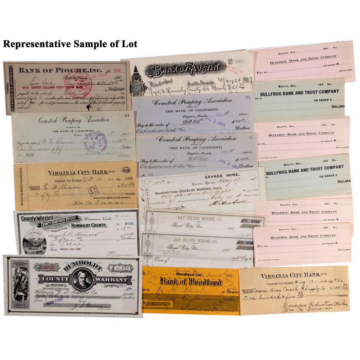 Lot of 170. Large swath of Nevada bank checks drawn on a variety of regional banks. Some from Virginia City, Beatty, Las Vegas and Lovelock. Most of these checks have been issued and cancelled though a few have not. Includes bank checks drawn on a variety of Nevada Banks (only a few are unissued.) Includes stubs for stock certs 723 & 729 (Comstock Tunnel Co.) All in great condition. Grab this vast collection of checks to add to or start your collection. - Gil Schmidtmann Collection