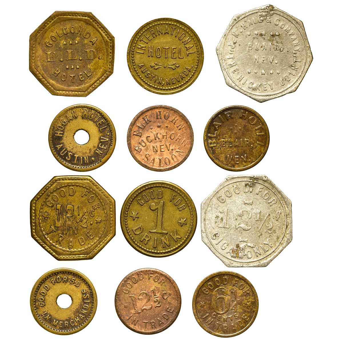 Lot of 6. 1) Austin, International Hotel. GF1D. XF. 2) Austin, Hogan Hotel. GF54cIM. VG. 3) Blair, JN Hall, The Hickey Joint. GF12 1/2 cigar only. Oct. Aluminum. VG. 4) Blair Hotel. GF6 1/4IT. Fine. 5) Buckhorn, Elkhorn Saloon. GF12 1/2IT. Cleaned. Fine. 6) Golconda, E.L.D. Hotel. GF12 1/2cIT. Fine. Blair was laid out in 1906 after the purchase of the Silver Peak mines by Pittsburgh Silver Peak Gold Mining Co. It was named after a wealthy financier of the company from the 1860s, John I. Blair [Carlson, 1974].
