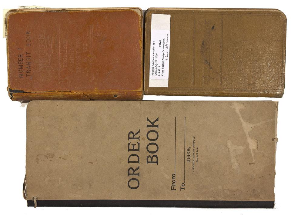 Lot of 3. 1. Cross Section Assayer's Notebook. Hard cover in mustard color. Nevada and California contents. Grid sheet pages. Few torn pages, newspaper column attached to a page inside, along with mentions of mines like the Buffalo Mine. Table of contents of mathematical terms. Stained along the edges. 4 1/2" x 7 1/4". Good condition. 2. Orange hard cover survey/mining transit book No 422. Eugene Dietzgen Company, Fairview NV. Left pages are in column format, right pages are in grid. Small sketches and numbers throughout. Binding is almost torn off. 4 1/4" x 7". Good condition. 3. "1990 1/2" Order Book. About 1/4 of the book is used. Personal ledger. Black binding. Tie string at the top. Seems to have been cropped at the bottom. Stains throughout the cover. 5 1/2" x 13". Good condition.