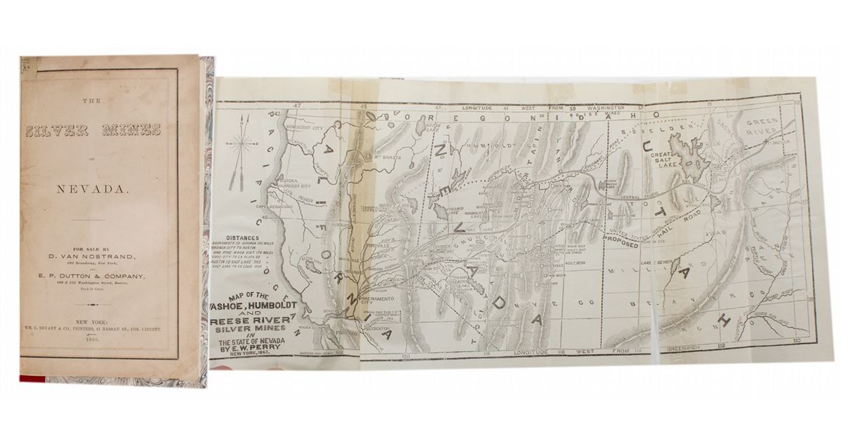 This is a very rare publication showing the silver mines of the Comstock in the last year of the Civil War. The rebound 5.5"x 9.5" book is 77 pages long and contains a fold out map of the region. Although there is no author credit, the title page reads FOR SALE BY D. VAN NOSTRAND 192 BROADWAY, New York AND E.P. DUTTON COMPANY 106 135 WASHINGTON STREET, BOSTON. This is indeed a great collectors’ item. It’s in excellent condition and again, very, very rare.