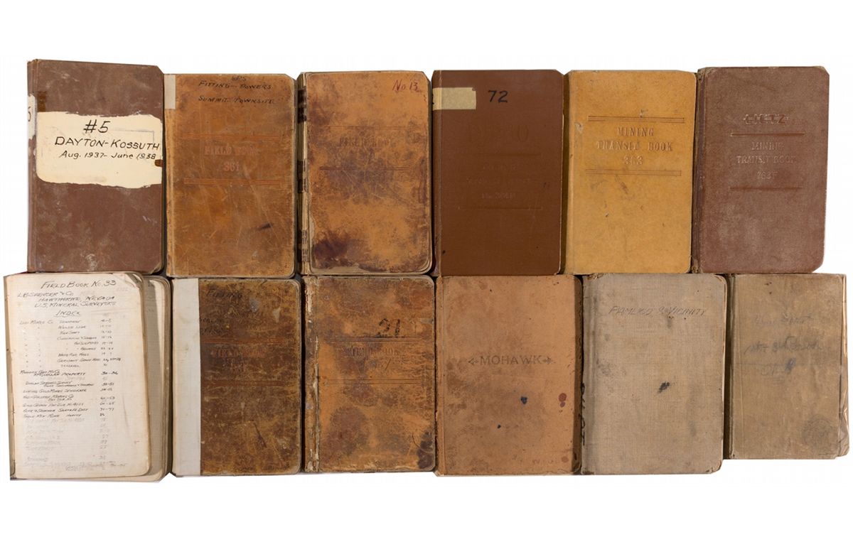 Lot of 12: series of detailed mining survey books, inscribed in pencil. Contains hand-drawn maps, illustrations, estimates, findings, assay counts, etc. from all over Nevada. Dates vary from the early 1930s. These illustrations and inscriptions are keen insights into the workings and potentials of the various mines, their positions, layouts, shafts, tailings, and other vital information of the times. These books are in various grades of condition, typically good to very good, showing signs of age and wear. A few have broken spines, or loose covers. They typically measure 7 x 5. A very unique collection. Maish Collection HKA#62290