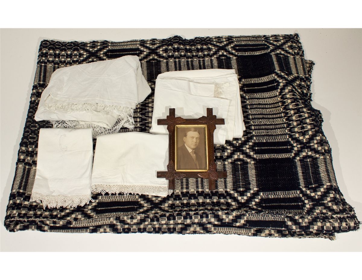 This lot contains 6 personal pieces from George Wingfield’s Estate. 1) Photograph of George Wingfield as a young man. The photograph measures 7" x 4.5" and the frame measures 12" x 9.55." The photograph has some wear including a finger print smudge and small marks. Fine. 2) Blue and white cotton and wool blanket that appears to have been made by George Wingfield’s Mother, Martha Spradling. There is very little wear on this item and overall all the item is in good condition. 3) White coverlet the measures 88" x 54" and has several decorative images including flowers and hearts. There is some yellowing and stains, but overall the piece is in fine condition. 4) Is a 96" x 80" white coverlet, there are some minor stains, but overall fine. This piece was given to George and Roxy Wingfield in 1931. 5) and 6) are matching pillow cases. Each piece measures 30" x 21.5" and has an embroidered "G." Overall the pieces are in fine condition. Spradling-Wingfield Estate HKA#62956